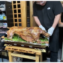 在モンゴル日本国大使館の元公邸料理人である鈴木裕子さんが3月、「まんぷくモンゴル! 公邸料理人、大草原で肉を食う」(産業編集センター)を出版。そのお祝いを兼ねて、東京・神楽坂のモンゴル料理店「草原の料理 スヨリト」で羊の丸焼きを食べた。羊の丸焼きは通常メニューではないそうだが、15人以上で予約注文できる。