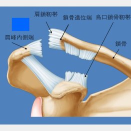 肩鎖関節は、鎖骨と肩甲骨をつなぐ関節です。関節を構成する靱帯(肩鎖靱帯や烏口鎖骨靱帯)が損傷し、断裂することで、鎖骨の先っぽである「遠位端」という部分が、「肩峰内側端」から脱臼します(イラスト=森先生提供)。
