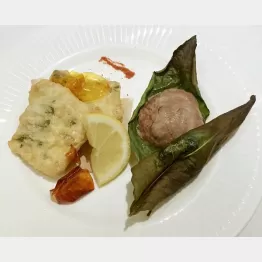 19周年ということで、スタッフ全員で考えた全19品のコース料理。温前菜2種盛りのうちの一品は、ソムリエの福田さんが横須賀で自ら釣ってきた太刀魚のフリットだ。