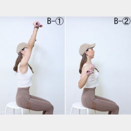 【B】①タオルの両端を持ち、ぐーっと上に上げる②タオルを鎖骨のところまでぐーっと引き下げる。