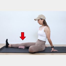 【C】床に座り、片足を伸ばす。折り畳んで厚みを出したタオルを、伸ばした方の足の膝裏に置く。両手を後ろに突いて体を支える。その状態でつま先を天井に向けたら、タオルをギュッと潰すように膝裏で押す。15回が目安。
