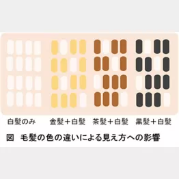 【A】白髪が目立たないカラーリングは、色味には関係なく、明るい色にすることです。図(写真)のように、黒髪と白髪はコントラストが大きいために目立つので、白髪交じりの黒毛を明るくすることでコントラストを小さくして目立たなくします。