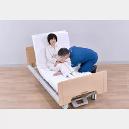 介護度が高い相手を、背上げができる介護用ベッドから起こして座らせる介助法を紹介する。