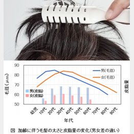 毛径(毛の太さ)は図の折れ線のように、男性は20歳くらいがピークで、加齢により徐々に細くなっていきます。このため、男性用シャンプーは頭皮洗浄が目的の製品が多く、女性用は髪を美しく見せることが目的の製品が多くなっています。