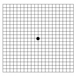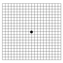 普段から老眼鏡をかけている人は、かけた状態で図から30センチ離れる。一方の目を手で覆い、片目ずつ中心にある黒い点を見る。格子状の線が波打って見えたり、途切れたり歪んで見える場合は、黄斑前膜に限らず黄斑に生じる病気の可能性が高いという。