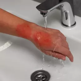 災害時の応急処置(1)流水で冷やし、体に張り付いた衣服は脱がさない