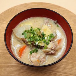 次に、「ミルク豚汁」です。食べやすい大きさに切った豚バラ肉、薄切りにした玉ネギ、いちょう切りにしたニンジン、石づきを取ってほぐしたシメジを用意します。