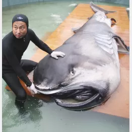 26日、三重・熊野灘で捕獲されたのは体長約5メートル、口の大きさが1メートルほどのメガマウス。漁船が水深100メートルの地点に沈めた巻き網を引き揚げたところ、元気よく泳ぐ姿が確認されたという。22日にも千葉・館山市沖で体長5.4メートル、重さ1トン以上のメスのメガマウスが定置網に掛かっているのが見つかり、いけすに移されたものの、翌23日に死んだばかり。幻のサメがなぜ、日本近海で捕獲が相次いでいるのか。鳥羽水族館(三重)飼育研究部の高村直人氏がこう言う。