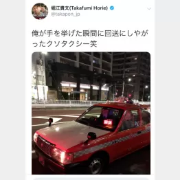 ホリエモンは今月19日、問題の写真つきで<俺が手を挙げた瞬間に回送にしやがったクソタクシー笑>などと投稿。理由なく乗車拒否されたらしく、カンカンなのだ。