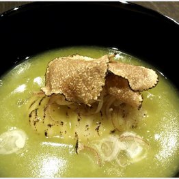 たとえば、ハモ。夏の定番食材。オーソドックスに調理するなら、骨切りしてサッと湯引きしたら、叩いた梅でいただくでしょう。それが高坂さんの手にかかると、鮮やかな緑色のスープに、軽く炙ったハモがひたっています。上に添えられているのは、イタリアンサマートリュフ。