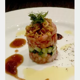 ミルフィーユ状に仕上げられたのは、和牛のミスジとキュウリを叩いたものでした。見事なフレンチと思いきや、ミスジは昆布締めに。それをベリーソースでいただくと、見事にマッチします。