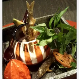 川に着水するようなイメージで盛られた稚鮎は器にダイブして提供されました。その器の脇には気持ちよさそうに泳ぐイメージのもう一匹が。そのソースが何とホワイトソースにうるか(稚鮎の内臓)を和えたものです。木に見立てたものはタデで、口直しにいい。