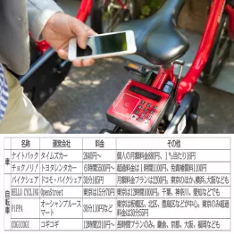 「ドコモ」も「HELLO」も、自転車は電動アシスト機能付き。長距離も安心だ。が、1時間を超えてこぎ続けるのは、きついはず。20キロ超の長距離で考慮したいのがカーシェアだ。「タイムズ」や「オリックス」「カレコ」など各社が、夜から翌朝にかけての割安プランであるナイトパックを用意している。「タイムズ」の場合、ベーシッククラスは2640円で、1キロごとに16円の距離料金が加算される。