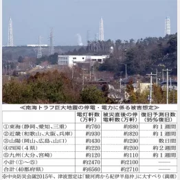 南海トラフ巨大地震(M8~9)の想定では、被災直後に40都府県で約2710万軒が停電するが、95%が復旧するまでに要する日数は、四国で約2週間、東海、近畿、山陽、九州は約1週間と意外に短い。
