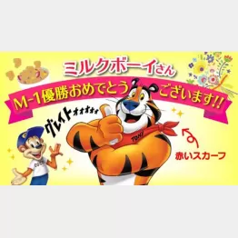 「ミルクボーイさんのコーンフレークネタで、『腕を組んだトラ』と弊社製品を連想させるワードが登場した。それを見ていた弊社のSNS担当が、『面白い!』と公式アカウントで優勝決定直後にトニー・ザ・タイガーのイラストとともに投稿しました。すると、リツイートが4.3万件、いいねが14.4万件つくなど大きな反響に。翌朝すぐに社内で検討し、即座にミルクボーイさんへコーンフロスティ1年分のプレゼントが決まりました」