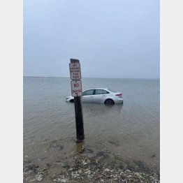 「ここより先、駐車禁止」と記された標識の先に止めた車が、満ちてきた潮で水没している写真だ。