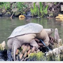 ひとつはサイズ。正確には実際に計測してみないと分からないが、体重は23~27キロほどで、カミツキガメとしては極めて大きいという。たぶんメスで、年齢は40~50歳と推定している。またカミツキガメは通常、川底に生息していて、岩の上などで甲羅干しをすることはほとんどないという。