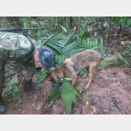 子供たちは、ヤシの葉と棒で簡単な小屋を作り、野生の果物を食べながら、生き延びているようだった。写真は政府機関「コロンビア民間航空局」のツイッターに掲載された犬による捜索のひとコマ。