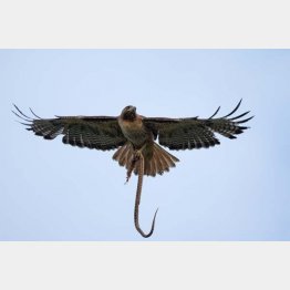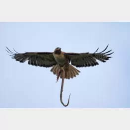 タカは上空を旋回しながら狙いを定めると、再び急降下。2回目も失敗し、結局、タカは4回目の攻撃でついにヘビをペギーさんから引きはがすことに成功。飛び去って行った。