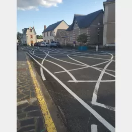 道路の車線を示す白線がゴチャゴチャに混線している……どう走ればいいの??? 話題になっているのはフランス西部アンジェ郊外の小さな町ボネでの光景だ。
