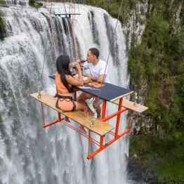ブラジルの冒険サービス会社の企画が話題! 高さ90mの滝つぼの上で食事はいかが?