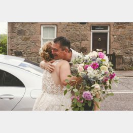「お抱え運転手」役を務めていた友人が、何とかしようと、走ってきたベンツを止め、男性ドライバーに事情を説明したところ、快く教会までシャロンさんを乗せていくことを承諾。写真は感激のあまり男性に抱きつくシャロンさんを結婚写真家のリア・マッケンジーさんが撮影したものだ。