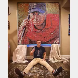 ゴルフ界のレジェンド、タイガー・ウッズの肖像画にご注目。写真をもとにした、さほどオリジナリティーを感じない点描画に見えるが、点の一つ一つがなんとゴルフティーだという。