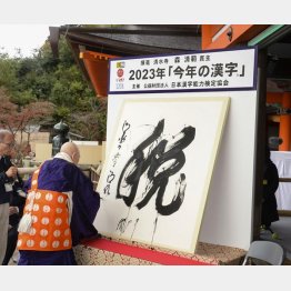 今年の世相を漢字1文字で表す「今年の漢字」に「税」が選ばれ、京都市東山区の清水寺で12日、森清範貫主が揮毫した。