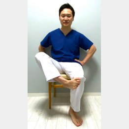【1】椅子に座ってひざを開き、かかとを反対の足に置く。足のつま先は前方に向かせる。