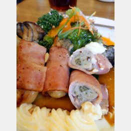 まずはハーフ&ハーフ(730円)で一人乾杯。ビールには牡蠣フライが定番だが、今日は「カキのベーコンプロシェット」(1400円=写真)。大ぶりの牡蠣をベーコンで巻き、串刺しにしてソテーしたもの。ちょっとシャレているでしょ。で、これがまたバカウマ(円生師匠風に)。牡蠣とベーコンの相性が実に良く、一口であんぐり。そこにハーフ&ハーフを流し込む。完璧。