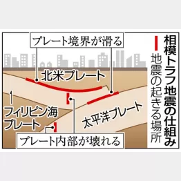 三浦半島(神奈川県)の西の相模湾から房総半島沖(千葉県)にある相模トラフは、太平洋プレート、フィリピン海プレート、北米プレートが重なり合う。過去にも大地震を繰り返し、1923年の関東大震災の震源地とされる。