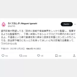 『望月記者が熱望してる「政府に芸能や音楽業界をしっかり監督し、指揮するような監督省庁」、丁度いま読んでるシェイクスピアの時代の本に出てるよ。不道徳という罪で劇場を取り締まり民衆を牢屋にガンガンぶちこんでる。政治家や権力にもっと力を持ってほしいと叫ぶ反権力主義者って、ワケわからんね』(ろくでなし子・美術家)