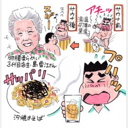 人気は温泉釜飯1200円だが、大田区名物の汐焼きそば850円と角ハイボール500円を注文。海苔たっぷり、カリカリの梅やプリプリのアサリなどを鶏ガラ塩ダレ特製ソースで炒めた焼きそばは、サッパリ味でサ飯にうってつけ。酒もススム君で、すみませーん、お代わり下さーい。