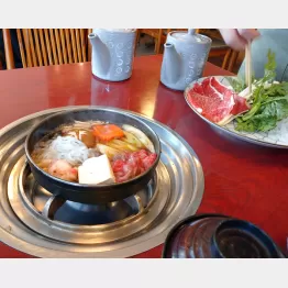 アタシは4人掛けテーブルに陣取りすき焼きランチ(1900円=写真左)とサッポロ黒生中瓶(480円)を。すき焼きを最初だけつくってくれたのは3代目のキレイな若女将。聞けば、お客の大半は地元の人たちだそう。とくに高齢者が数人で軽くつまんで飲んでいくらしい。昼は近くの店の若い店員やサラリーマンがとんかつを食べにやってくる。「知らない人はなかなかここまで入ってきにくいでしょうね」と若女将。確かに。
