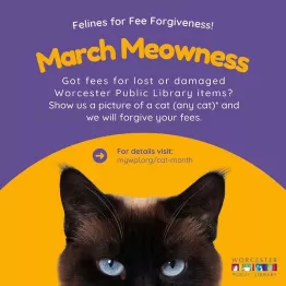 同州のウースター公共図書館(WPL)が3月限定で実施する「3月のニャー:猫で罰金を免除」というキャンペーンで、「WPLの貸し出し資料の紛失・破損で罰金が科せられている利用者は図書館に、猫の写真か絵を提供すれば免除する」というもの。