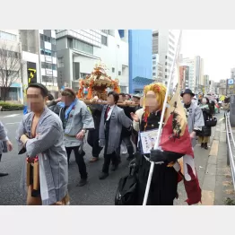 都内で新型コロナウイルス感染症の「まん延防止措置」がとられていた2022年3月。ノーマスクの集団が渋谷の街を練り歩いた。「コロナ問題を考える会」のデモだ。その中に、揃いのハッピを着て威勢のよい掛け声でみこしを担ぐ一群が。
