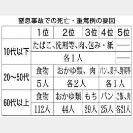東京消防庁がまとめた「救急搬送データから見る日常生活事故の実態」では、のどにものを詰まらせる事故も分析。死亡や重篤などのケースをまとめたのが〈表〉だ。なるほど、元気なはずの20~50代の死亡・重篤例の2位タイはおかゆと肉だ。ツルッと食べられそうなおかゆがのどに詰まるほど大量に口に入れる早食いはマズイ。