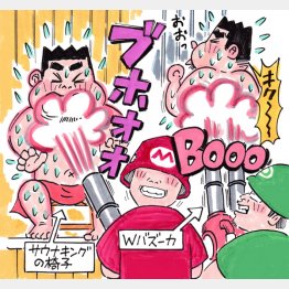おやっ、スーパーマリオブラザーズのコスプレ姿のスタッフが浴場に登場。サ室のマットを交換すると、爆風サービス開始のアナウンスが流れ出した。マジか。Y君と一緒に急いでサ室に戻ったら、「イス、いかがですか?」とマリオに勧められたのは、「サウナキング」と書かれた木製椅子で1脚のみ。