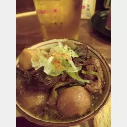 木枠のガラス戸越しに店内が見える。L字カウンターの端があいていたのでそこに滑り込んだ。サッポロ黒生の中(550円)と例のとろすじ芋煮込みハーフ(350円)を注文。つぎ足した濃い汁が染み込んだトロトロの牛すじにネットリの里芋。まずいわけないじゃん! この店大正解!