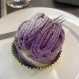 文化の薫りといえば、地元府中市民に愛されて150年、明治元(1868)年創業の老舗洋菓子店「モナムール清風堂本店」(④)もそのひとつ。1階がカフェ、2階がレストランとなっており、本日のお目当ては1階カフェのケーキ「紫式部」(税込み605円)。鹿児島県産紫芋を使った甘みを抑えた味わいのケーキだ。