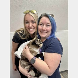 キャリーさんはすぐにカリフォルニアに飛び、ガリーナと再会。写真(本人のフェイスブックから)はその時のひとコマで左がキャリーさん、右は発見後、ガリーナの世話をし獣医に見せたブランディーさんだ。