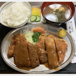 とんかつA定食(1400円)を食べる。肉厚の豚肉は脂が少なくヘルシーな甘みがあり、身が締まって歯ごたえ十分。デミソースは酸味が少なくフルーティーでとげがない。作って間もない味ではなく、いかにも長期間寝かせた味わいだ。