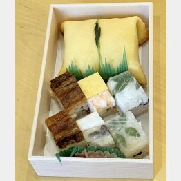 ふくさはまず薄焼き玉子をつくり、おからのおぼろ、ちらし寿司、焼きアナゴ、ハスの甘酢漬けをのせ、玉子をふくさ包みにしてミツバでくくる。銅板の温度が低いと玉子が張りついたり焼き目がついたりして、きれいな色の薄焼き玉子にならない。高熱で一気に焼き上げることが大事だ。
