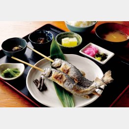 湯上がりには、炭火で中までふんわり焼かれた岩魚塩焼き定食を。ほかにも源泉温泉水100%で打った蕎麦やうどんもおすすめだ。