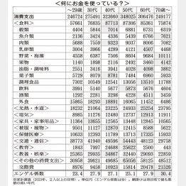 パンや米などの穀類や肉類をたくさん食べるのは40代、一方、魚介類や野菜・海藻にお金をかけるのは70代以上だ。アルコール(酒類)が好きなのは60代らしい。