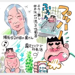 服を着てフロントで缶ビール250円を購入。天井にレトロなシャンデリアが飾られた休憩ルームのソファにどっかと座り、グビグビグビ。くぅ~、ウミャイ。ウルトラマンのフィギュアが置かれたガラス棚には、土地柄か著名人のサイン色紙がズラリ。「山田洋次監督もぶらりと寄ってくれたんですよ~」と2代目の奥さま小百合さん。物腰柔らかなご夫婦が営む銭湯は、昭和風情たっぷりな穴場です。 (イラスト・文=太田由紀)
