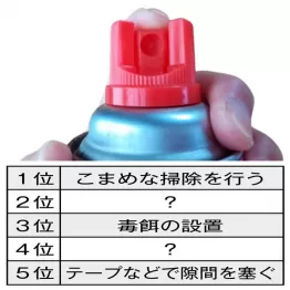 では、心当たりのある侵入経路・繁殖場所に対する対策を聞いたところ、1位は「こまめな掃除を行う」。ゴキブリのエサや繁殖場所、隠れ場所をできるだけなくすことが何よりだから、こまめな掃除は必須だろう。隠れ場所としては、ゴミ捨て場近くのコンクリートの割れ目、マンホールや排水溝の中、庭の雑草や落ち葉の下、植木鉢や石垣などが考えられるそう。マンホールや排水溝の中まで掃除するのはなかなか大変だが……。