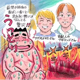 15~17度の備長炭の水風呂からかけ水で汗を流してザボン。あの打ち水を頭に受けて、火照りを冷ましたら、もうひとつの水風呂へ。こちらは水温シングル。肌を刺す冷たさは、あ~、思った通りマジ快感! 放心状態のところに、毎時00分に行われるアウフグースの合図が響く。「毎回違うテーマで行っています」と気さくな支配人のアタランドさんこと安宅正範さん。