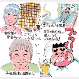 服を着てフロントで愛海ちゃんにエビス生ビールのジョッキを受け取って休憩ルームへ。「まるで金持ちの家みたいでしょ」と3代目・岡田博樹さんの言葉通り、そこは3階まで吹き抜けの高天井! ゴージャスな広い部屋のソファでくつろぎながらグビッグビ。正面には大型モニターが設置され、背面には3階部分までの巨大な書棚。何ともリッチな気分になった。さらに愛煙家にはうれしい喫煙室が3階に。ストレス発散にはもってこいの穴場銭湯だった。