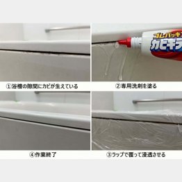 さっそく実践してみた。市販のカビ取り剤を浴槽の黒カビが目立つ場所に塗布。すぐにラップを張ってジェルをつけ置きにする。